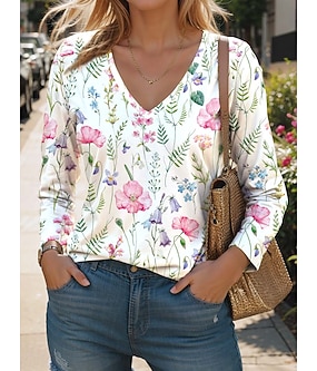 Dame T-skjorte V-hals langermet tunika blomster mote moderne casual vanlige topper daglig helge trykk svart hvit rosa blå grønn høst vinter
