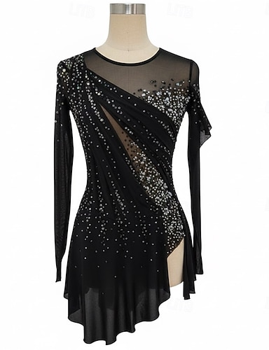 Kunstløpskjole dame jenter skøytekjole svart lappeteppe asymmetrisk fald høy elastisitet treningsklær konkurranse skøyteklær klassisk krystall / strass lange ermer kunstløp figur