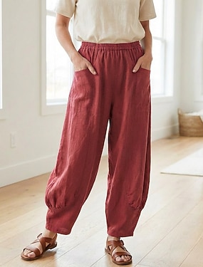 Dame Linbukser i bomull Bred Bukseben kinesisk Sommerbukser Ferie Gatemote Grunnleggende Full lengde Middels midje عادي Lomme Elastisk midje comfy Komfort Uelastisk Daglig utendørs Gate Vinrød
