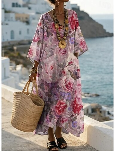 Dame maxikjole i linlignende pustende lett kaftan 3/4 langermet rund hals casual shiftkjole A-linje kjole boho daglig ferie date blomster mørk gul lys rosa gul lys grønn