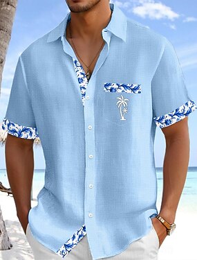 Herre Skjorte Linskjorte Sommerskjorte Strandskjorte Skjorte med knapper Blomstret Ferie Dagligdagstøy Hvit Rosa Navyblå Lyseblå Kortermet Aftæpning Sommer Klær Lomme foran