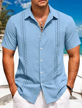 Herre Skjorte linskjorte Guayabera skjorte Sommerskjorte Strandskjorte Feriereise Avslappet Hvit Grønn Lyseblå Kortermet Krage Sommer Vår Klær