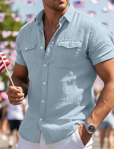 Herre Skjorte Linskjorte Uformell skjorte Skjorte med knapper Bomullsskjorte عادي Feriereise Gate Svart Hvit Kakifarget Militærgrønn Kortermet Aftæpning Sommer Klær Lomme