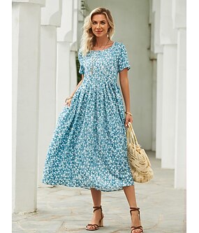 Dame Midikjole Uformell kjole Kjole med A-linje Stilfull Fritid Feriereise Daglig Normal Blomstret Kortermet Crew-hals Rosa Lyseblå Sommer Vår