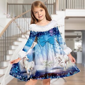 Barn Jente Kjole Dyr enhjørning Langermet Avslappet Pelskanter Crewneck Bedårende Daglig Polyester Ovenfor knéet Uformell kjole Swingkjole Kjole med A-linje Høst Vinter 3-10 år Rosa Blå Himmelblå