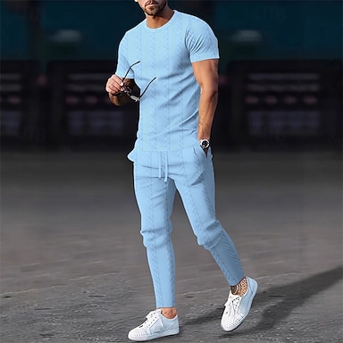 Herre T-skjorte drakter Skjorte- og buksesett 2 stk antrekk Kortermet Crewneck Sommer Vår عادي Mote Fritid Jacquard 2 deler Feriereise Dagligdagstøy Ut på byen Svart Hvit Kakifarget Topp T-skjorte