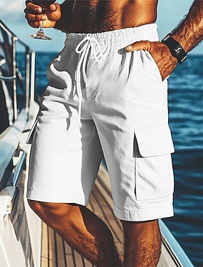 Herre Shorts Lin Shorts Sommershorts Strandshorts Snorer Elastisk midje Flere lommer عادي Komfort Pustende Kort Feriereise Ferie Strand Hawaiisk Bohem Svart Hvit