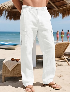 Herre Linbukser Bukser Sommerbukser Strandbukser Lomme Snorer Rett ben عادي Komfort Pustende Feriereise Daglig Ferie Hawaiisk Bohem Hvit Kakifarget