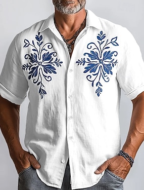 Herre Linskjorte Sommerskjorte Strand Klær Skjorte med knapper Blomster Feriereise Avslappet Hvit Blå Kakifarget Kortermet Aftæpning Sommer Vår Klær