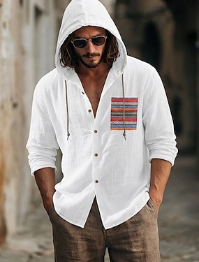 Herre Skjorte Linskjorte Sommerskjorte Strandskjorte Skjorte med knapper Skjorte med hette Bohem Avslappet Feriereise Hvit Langermet Med hette Sommer Vår Klær Lapper