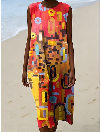 Kvinnemidi Kjole Linlignende Shift Kjole Ferie Uformell Strand Daglig Gå ut Regular Fit Grafisk Geometrisk Ermeløs Crew Neck Blå Gul Lilla Oransje Sommer Vår