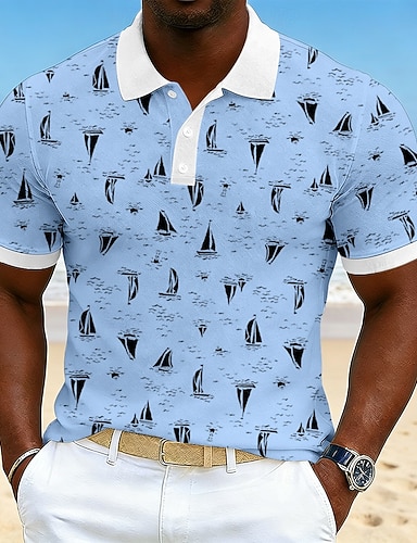 Herre Geometrisk Poloskjorter Kortermet Poloskjorter Knaphul Fritid utendørs Ferie Dagligdagstøy Lomme 3D-utskrift Vår sommer Blå Svart Lilla