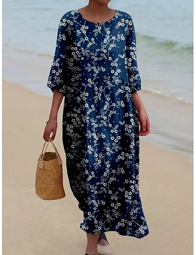 Dame Maxikjole Uformell kjole Kjole med A-linje Løstsittende kjole Mote Moderne Daglig Feriereise Ut på byen Normal Blomstret Kortermet Crew-hals Blå Vår Høst