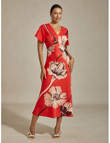 blomstertrykk v-hals halvlange sommerkjole oransje blomstermønster avslappet ferie strandantrekk elegant stil minikjole