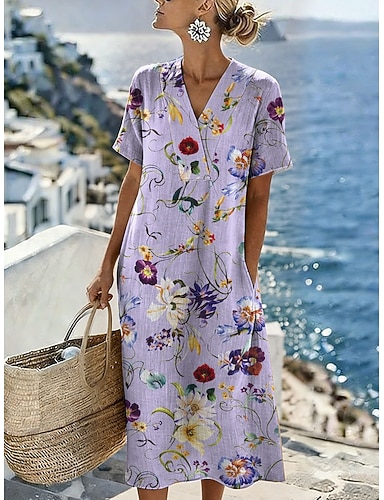 Dame Midikjole Skiftkjole Solkjole Ferie Fritid Strandstil Normal Blomstret Grafisk Kortermet V-hals Blå Hvit Rosa Lilla Sommer Vår
