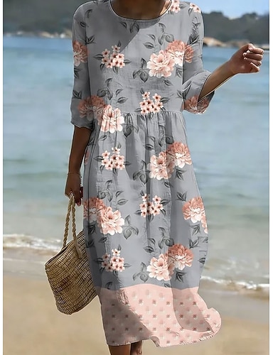 Dame Midikjole Solkjole Sommerkjole Ferie Fritid Bohem Strand Ferie Løstsittende Blomstret Grafisk 3/4 ermer Crew-hals Blå Hvit Rosa Sommer Vår
