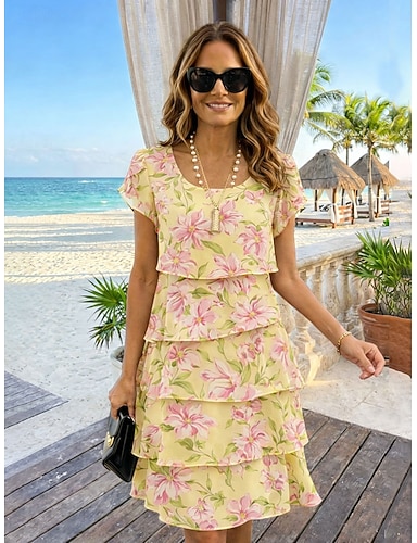 Dame Knelang kjole Skiftkjole Sommerkjole Ferie Bohem Strandstil Stevnemøte Normal Blomstret Grafisk Kortermet Crew-hals Gul Rosa Lilla Grønn Sommer Vår