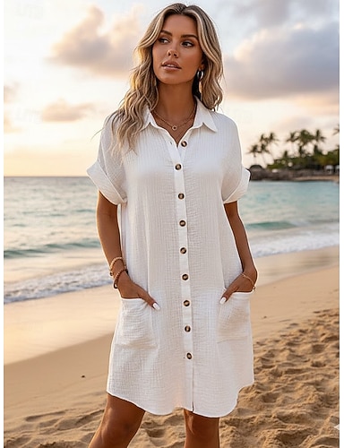 Kvinne Linstoff Lignende Falsk Bomull Linstoff Mini Kjole Skift Kjole Casual Daglig Vanlig Passform Ensfarget Kortermet Krage Hvit Sommer Vår