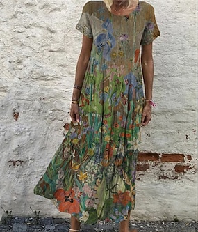Dame Maxikjole Skiftkjole Uformell kjole Årgang Grunnleggende Daglig Feriereise Helg Normal Blomstret Kortermet Crew-hals Blå Vin Grønn Sommer Vår
