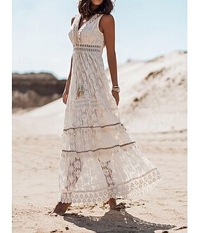 Dame Lang kjole Maxikjole Maxikjole Boho-kjole Blonde kjole Hvit kjole Boho elegante kjoler Bohem Strand Feriereise Bryllup Normal Ermeløs V-hals Hvit Aprikos Sommer