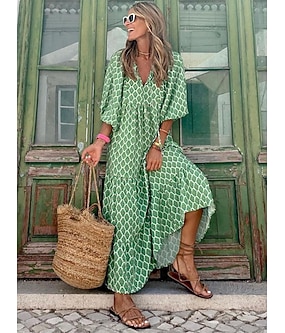 kvinners geometrisk trykk v-hals lanterne ermet maxi kjole tilfeldig hverdagsferie 3/4 lengde erme sommer vår