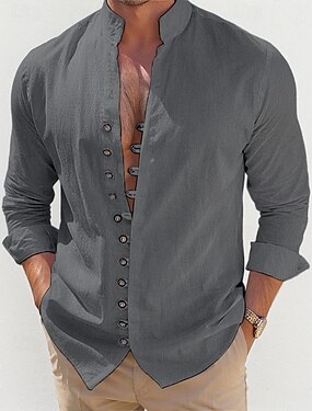 Herre Skjorte i bomullslin عادي Feriereise Svart Hvit Kakifarget Mørkegrå Langermet bestefars krage Klær