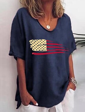 Dame Skjorter i bomullslin T skjorte Trykt mønster USA Fritid Kortermet Rund hals Vanlige topper Feriereise Uavhengighetsdagen Svart Vin Navyblå Sommer