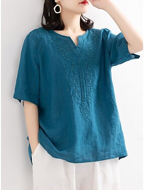 Dame Skjorte Knapp opp Bluse Imitert bomullslin Broderi Blomstret Stilfull Fritid Kortermet V-hals Vanlige topper Daglig Hvit Rød Navyblå Kakifarget Sommer Vår Høst
