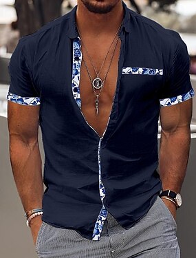 Herre Skjorte linskjorte Sommerskjorte Strand Klær Uformell skjorte Skjorte med knapper Fargeblokk Feriereise Curise Svart Hvit Rosa Navyblå Kortermet Knaphul Sommer Klær Lapper