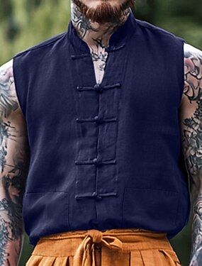 Herre Skjorte Linskjorte Sommerskjorte Strandskjorte Helfarge Feriereise Gate Svart Rød Navyblå Kakifarget Ermeløs Kinesisk Krave Sommer Vår sommer Klær Knapper