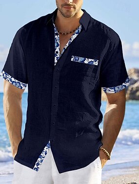 Herre Skjorte linskjorte Sommerskjorte Strand Klær Skjorte med knapper Blomstret Feriereise Curise Hvit Rosa Navyblå Blå Kortermet Knaphul Sommer Klær