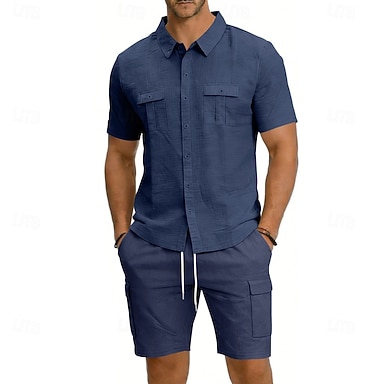 Herre Linskjorte 2 deler Skjortesett Og Cargoshorts Shorts Lin Shorts Sett عادي Daglig utendørs Feriereise Aftæpning Kortermet Sommer Mote Fritid Bekvem Klær