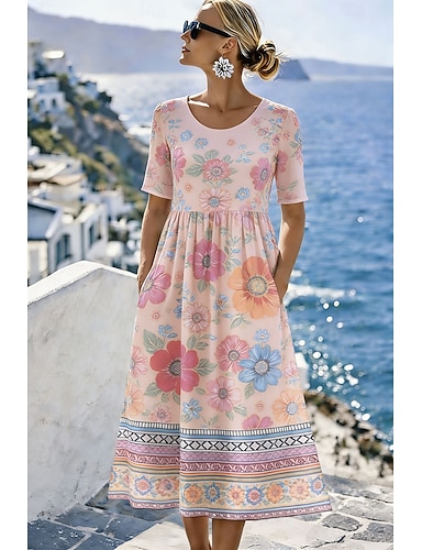 Dame Midikjole Uformell kjole Sommerkjole Ferie Fritid Strandstil Ferie Normal Blomstret Grafisk Kortermet Crew-hals Blå Rosa Lilla Grønn Sommer Vår