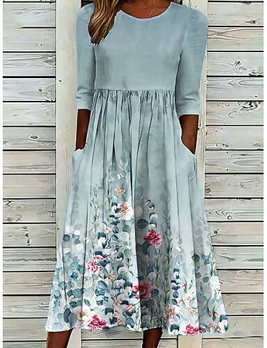 Dame Midikjole Kjole med A-linje Fit And Flare Dress Ferie Fritid Normal Blomstret Grafisk Langermet Crew-hals Rosa Grønn Beige Sommer Vår