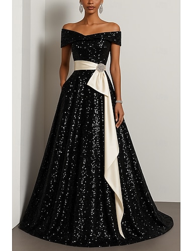 A-linje Kveldskjoler Elegant Formell kjole Formell Bryllup Gulvlengde Kortermet Løse skuldre Paljetter med Glimmer Plissert 2025
