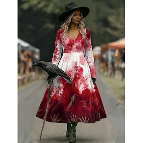Dame Heks Trykk Midi Kjole A-Line Kjole Ferie Uformell Daglig Vanlig Passform Blomster Grafikk Hocus Pocus Lang Erme V Hals Svart Rød Brun Vår Høst