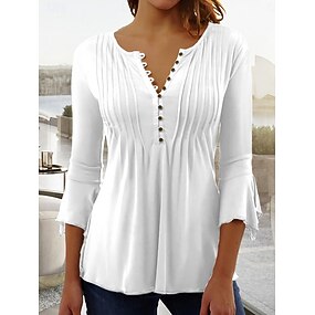 Dame T-skjorte Ensfarget Plain Elegant Bohemia Stilren 3/4 Lengde Ermer Volanger Ermer V-Hals Vanlige Topp Arbeid Daglig Ferie Ruched Volanger Knapper Svart Hvit Vin Rød Sommer Vår Høst