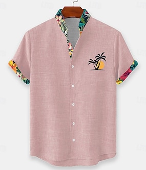 Herre Kokosnøttre Tropiske planter Blomster Hawaii skjorte Skjorte med knapper Skjorte med stativ krage Kortermet Hawaiisk Strandferie Sommer Vår Kinesisk Krave 3D-utskrift Lin som skjorte Blå Rosa