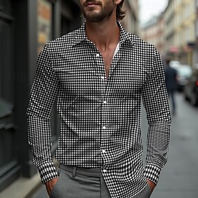 Herre Gitter / Teppe Mønster Uformell skjorte Skjorte med knapper Langermet Fritid Business Casual Avslappet Vår Høst Aftæpning Knepp opp Svart