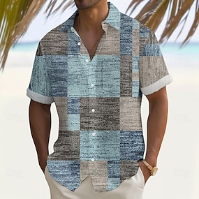 Herre Geometrisk Fargeblokk Gitter / Teppe Skjorte Sommerskjorte Skjorte med knapper Kortermet Fashion Casual Gateklær Feriereise Ferie Sommer Aftæpning 3D-utskrift Front One Lomme Lin som skjorte