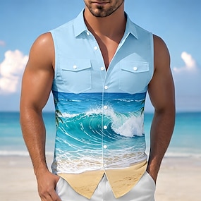 Herre hav Landskap Sjø Skjorte Hawaii skjorte Aloha skjorte Ermeløs Feriested Strandferie Sommer Vår Aftæpning 3D-utskrift To lommer foran Skjorter med knapper Blå blå 2# Blå 1#