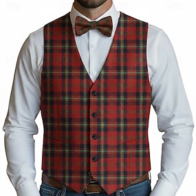 herrevest ferie fest mote høst vinter lommeknapper polyester komfortabel rutete enkeltspent firknapps v-hals normal passform mørkerød rød vest