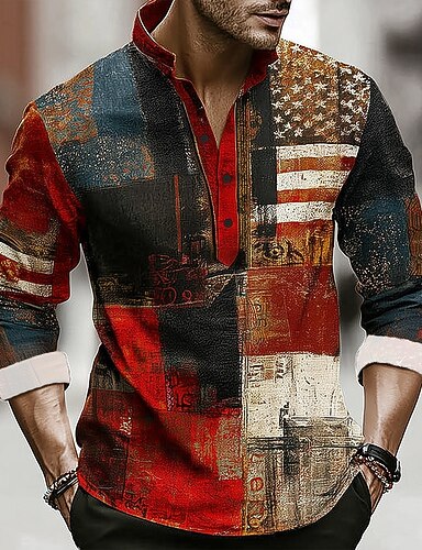 Herre Geometrisk Fargeblokk Lapper Skjorte Henly-skjorte Skjorte med stativ krage Langermet Vintage retro Feriereise Avslappet Sommer Vår Mandarin Knapper Lin som skjorte Rød Blå Lilla Oransje Grønn
