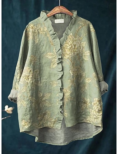 Dame Skjorte Linlignende Pustende Lettvekts Knappe Ned Tunika Skjorte Krage Lange Ermer Blomst Daglig Stilfull Lange Topper Dagligs Trykk Lys Grønn Vår Høst