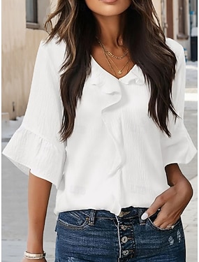 Dame Bluse Drapering Helfarge Stilfull Grunnleggende Fritid 3/4 ermer V-hals Vanlige topper Daglig Blå Svart Hvit Rød Grønn Sommer Vår Høst