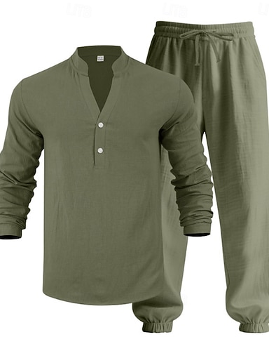 Herre Linskjorte 2 deler Popover skjorte Og Linbukser Bukser Uformelle bukser Sett عادي Avslappet Daglig utendørs V-hals Langermet Sommer Vår Mote Fritid Bekvem Klær