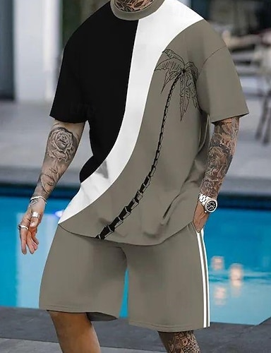 Herre Palmetre 2stk T-skjorter sett Sommertopper Kortermet Korte bukser Crew-hals Sport Fritid Strandferie utendørs Sport Daglig 3D-utskrift Sommer Svart Grønn Rød