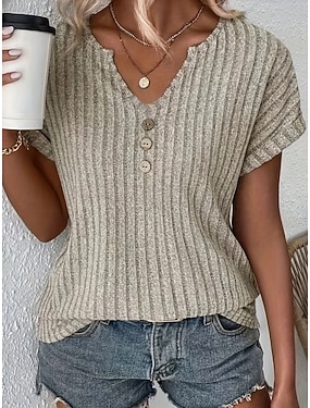 Dame Ribbelte strikkede topper Elegant Stilfull Sexy Kortermet Puffermer V-hals Vanlige topper Daglig Ut på byen Svart Hvit Kakifarget Sommer Vår