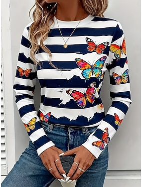Dame T skjorte Trykt mønster Grafisk Sommerfugl Stripet Årgang Stilfull Moderne Langermet Crew-hals Vanlige topper Daglig Helg Blå Gul Rød Lilla Høst Vinter