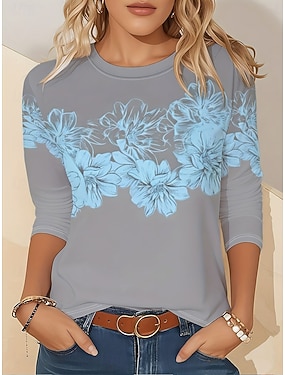 Dame T skjorte Trykt mønster Blomstret Grafisk Planter Årgang Mote Stilfull Langermet Crew-hals Rund hals Vanlige topper Daglig Helg Lyseblå Vår Høst Vinter